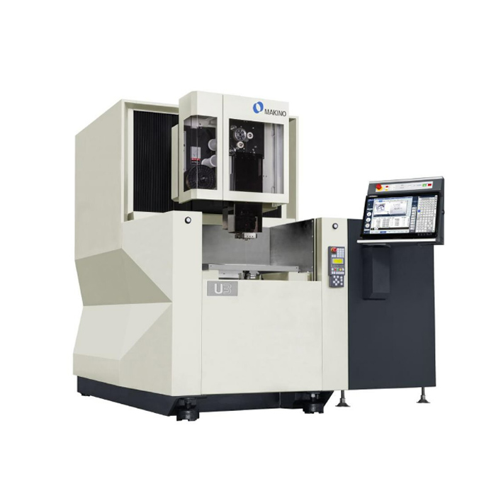 牧野U3线切割放电加工机具有理想的速度、精度和表面处理能力,能更加有效地解决加工条件更苛刻的加工应用。该机器采用固定工作台的设计,不管工件大小和重量,都能提供可靠的精度。通过气动升降式前门,操作者可以很好地操作工作槽。即使在桌面上有较大的工件,操作者也可以对工件的底面或下机头进行操作。U3机器采用了节省空间的设计,将双电极库安装到机器铸件中,在提高热稳定性的同时减少了占地面积。